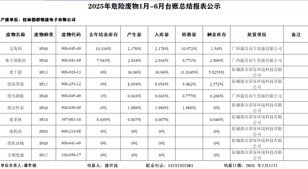 2025年危险废物1月-6月台账总结报表公示2025/07/17环境防治 1379 上一篇: 2025年危险废物1月-4月台账总结报表公示下一篇: 2025年危险废物1月-12月台账总结报表公示 相关推荐 2024年第一季度申报报表 2024/09/05 1052 查看全文 2022年危险废物污染环境防治信息公开 2022/11/11 1192 查看全文 危险废物贮存设施公示材料 2022/11/11 2173 危险废物贮存设施公示材料 查看全文 2025年危险废物1月-4月台账总结报表公示 2025/05/17 1371 查看全文